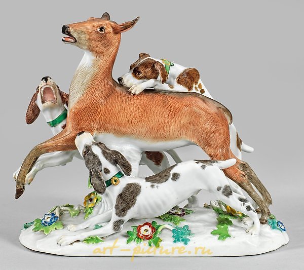 在一个椭圆形的自然主题底座上装饰着花藤,摆放着一个完全由塑料制成的景观模型,这个模型是一只罗特韦勒犬与其他三只狗一起放置的。彩绘作品上还点缀了一丝金色。可能是乔安·约阿希姆·坎德勒于1758年的作品,型号为2693。这件作品已经修复过,并带有十字剑标记。它的高度为17.5厘米,长度为22厘米。请与皮茨希的《瓷器猎物》目录编号26进行比较。这个20世纪早期的瓷器人物群描述了一幅狩猎场景。它已经修复过,并带有十字剑标记。制作于20世纪初的迈森。
