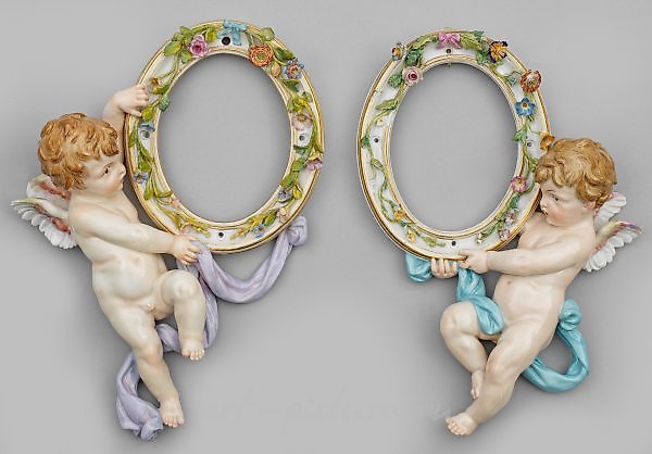 作为对应的关系,这些完全雕塑的小天使具有极高的可塑性。他们描绘了一名躺卧的、扁平的小天使,身穿流动的彩色或浅蓝色布料,手持着一个装饰有塑料花环的椭圆形画框。多彩绘画上还点缀有金色图案。这些作品被归属于约翰尼斯·丹尼尔·施赖特米勒(Johannes Daniel Schreitmüller)于1880年创作,型号分别为L 192和L 193。它们没有反光玻璃,并且只有轻微的瑕疵或修复。交叉的剑标志表示这是美因茨制造的。这些罕见的小瓷墙镜以丘比特形象为特色,可追溯到19世纪晚期。