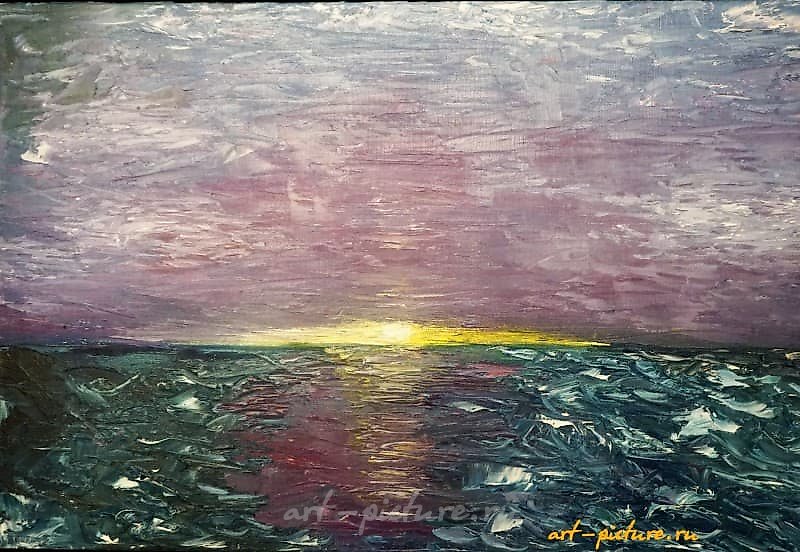 画作《海上日落》,油画,尺寸 60x40 厘米。