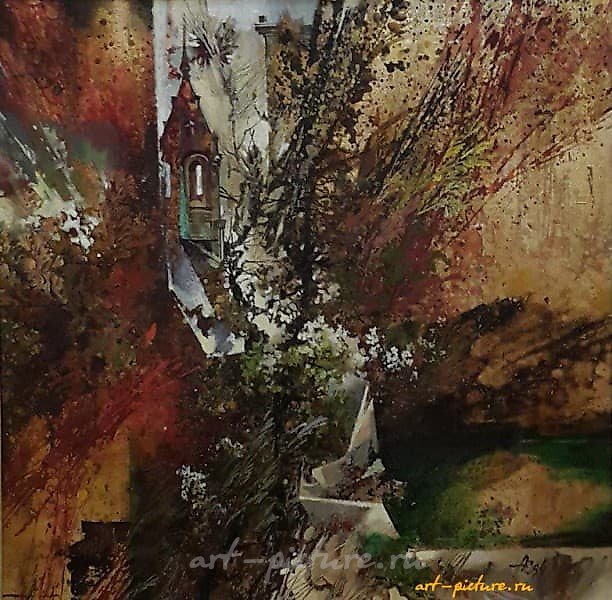 Торжественный ландшафт, запечатленный на картине, позволяет нам заглянуть в мгновение, наполненное величием и даже некоторой таинственностью, в котором архитектура и природа сплетаются в единое целое. Каждое утонченное мазок кисти, каждый акцент на палитре передают нам не просто визуальную информацию, но и надолго сохранившиеся эмоции, погружающие нас в атмосферу забытого времени. Мы видим, как фрагмент башни с красной крышей и точными окном очерчивается на фоне буйной растительности, словно каждая деталь была преднамеренно создана для того, чтобы вызвать в зрителе трепет и восхищение.