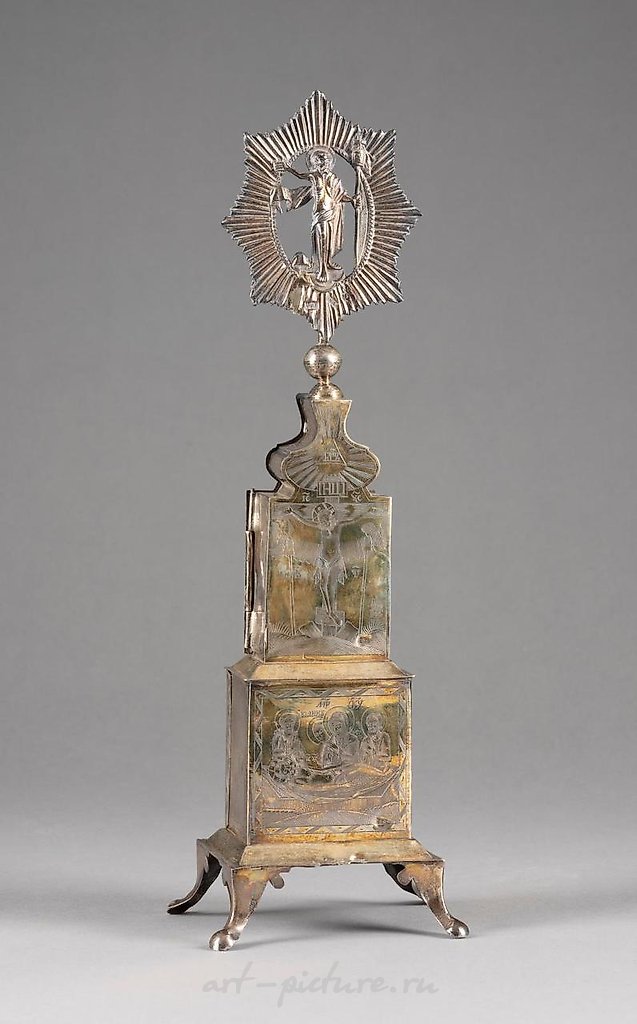 莫斯科,1817年。顶部以尖顶形式结束,并装饰有基督复活的图像。标有城市印记、鉴定师印记、84标准和用西里尔字母标记的"AL"大师印记。高37厘米,重446克。