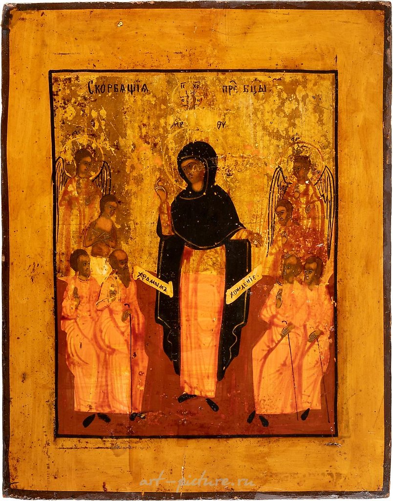 一幅描绘俄罗斯19世纪"喜悦众忧"圣母的图标。使用温和的颜料在木板上绘制。背景由涂有金漆的银制成。部分修复过。尺寸为29 x 22.6厘米。这幅图标是19世纪俄罗斯的"喜悦众忧"圣母图标。单板带有两个背面夹板。使用蛋彩在石灰地上绘制,背景为银色。