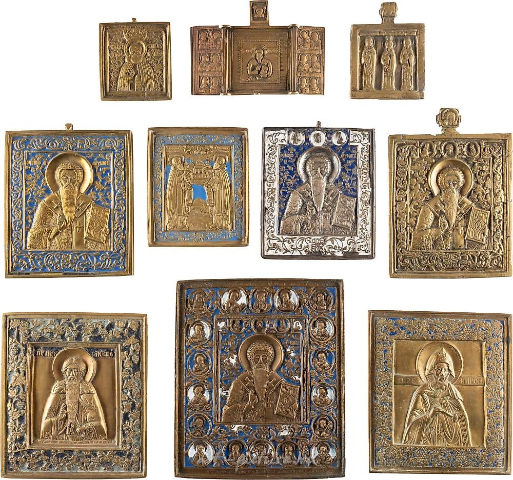 九个铜制图标和三联画,描绘了选定的俄罗斯圣徒,约为1700-19世纪(部分采用较晚的搪瓷),以浮雕方式铸造,部分涂有蓝色和白色搪瓷,部分镀银。搪瓷上有轻微的磕碰和磨损。高度为5.8-13.9厘米。