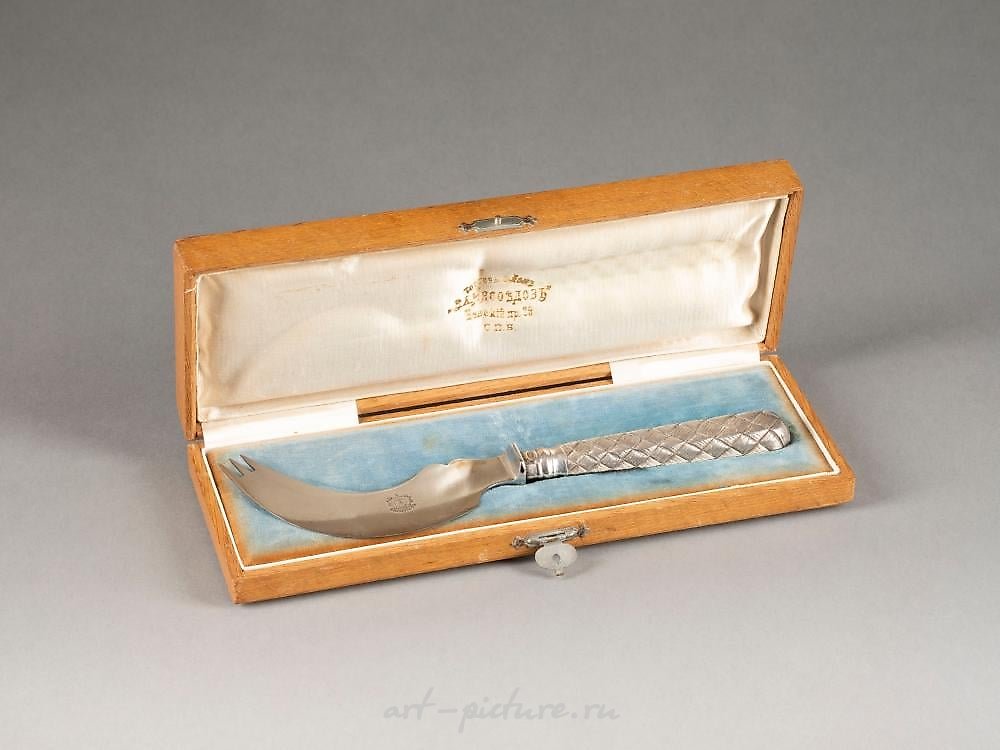TROMPE L'OEIL, Russia, St. Petersburg, Andrei Artamonov, 1896-1908. Silver, fine engraving. L. 23.2 cm. Marked with the sign of the district inspection administration with embossed and engraved pattern, imitating basket weaving. Marked with the hallmark of the assayer, standard 84, and the mark of the master "AA". Contained in an oak retail case. Length 23.2 cm.