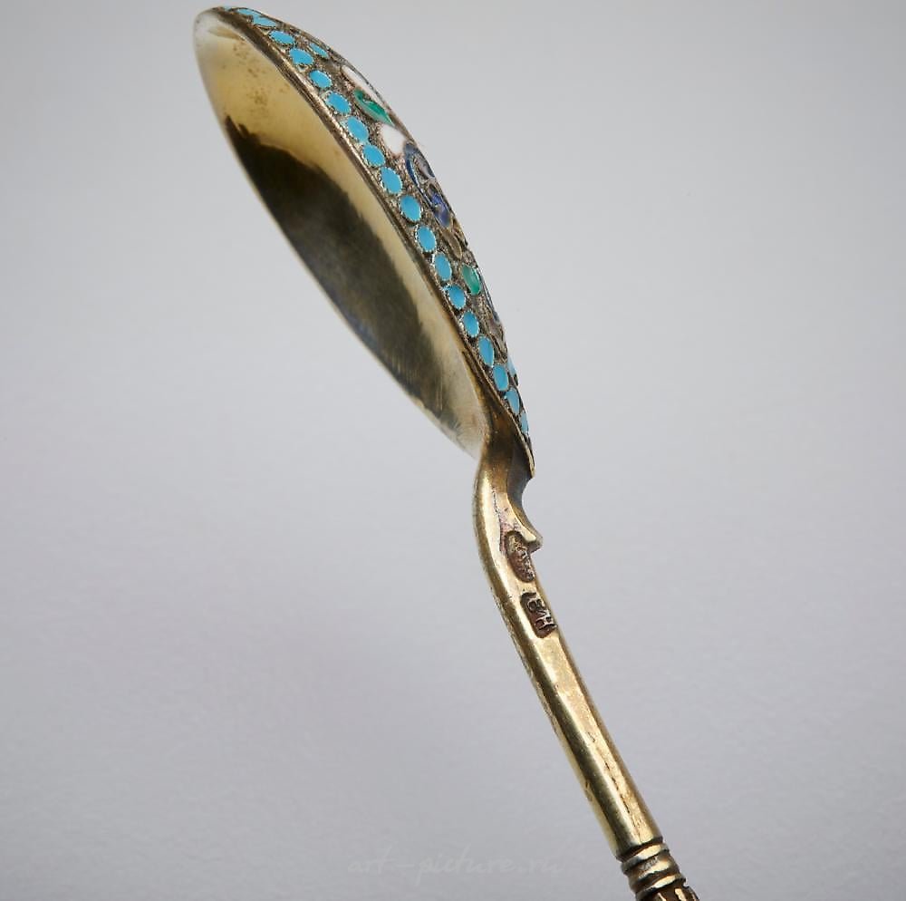 19-20世纪的俄罗斯银匠。六个镀金和彩绘搪瓷的银茶匙。银标记为尼卡诺夫·佐洛托夫。总重量:0.124公斤。来源:私人收藏,米兰。尺寸:13.00 x 0.60 x 2.70厘米。