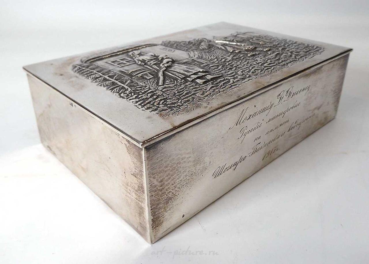 20世纪初的俄罗斯银盒,包裹镀金,铰链盖装饰着乡村风景中的人物,制造商KC,宽度17.5厘米,19.5盎司,带有个性化铭文。 17.5x11.5x5.5厘米。