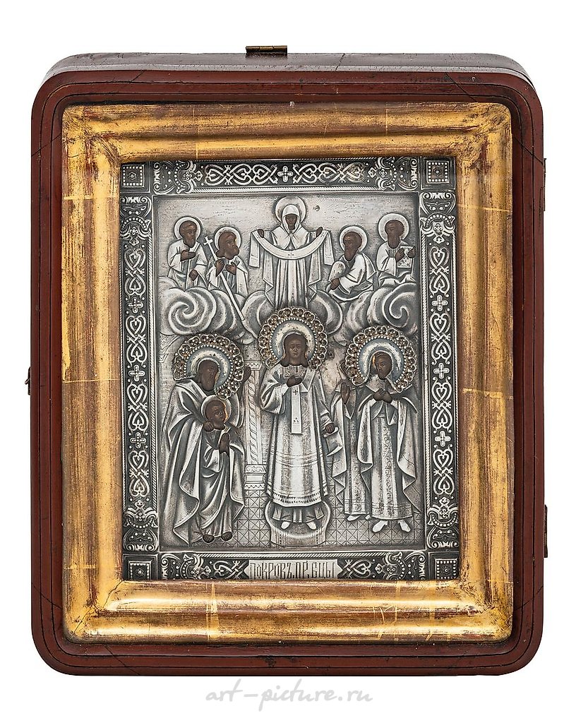 尺寸为22.5x17.5厘米(30x25.5厘米)。1891年的俄罗斯圣像,镶有银边和镀金木盒;经过修复和损失。
