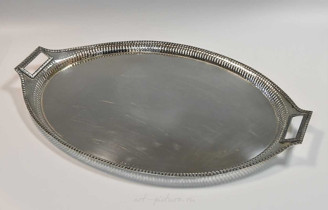 19世纪初由俄罗斯金属制成的银托盘,带有两个手柄,制造商的邮票尚未被追踪(西里尔文FN),Mikhail Mikhailovich Karpinsky样品,莫斯科,1823年,84线轴为银标准875/1000,椭圆形,对称切割的画廊和螺纹边缘,两个带有装饰边框的矩形手柄,手柄上方55x35厘米,54.6盎司。