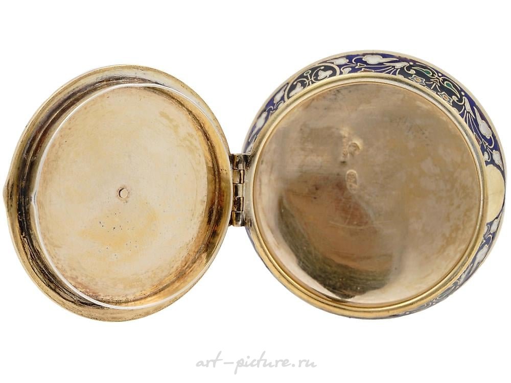 小型俄罗斯银盒,镀金盖子。制品上装饰有釉花图案,采用克洛伊松技术,在钴蓝色背景上。银标志为84纯度,并在制品内部有制造工坊标记。重量:56克。俄罗斯银器、装饰品和收藏品。
