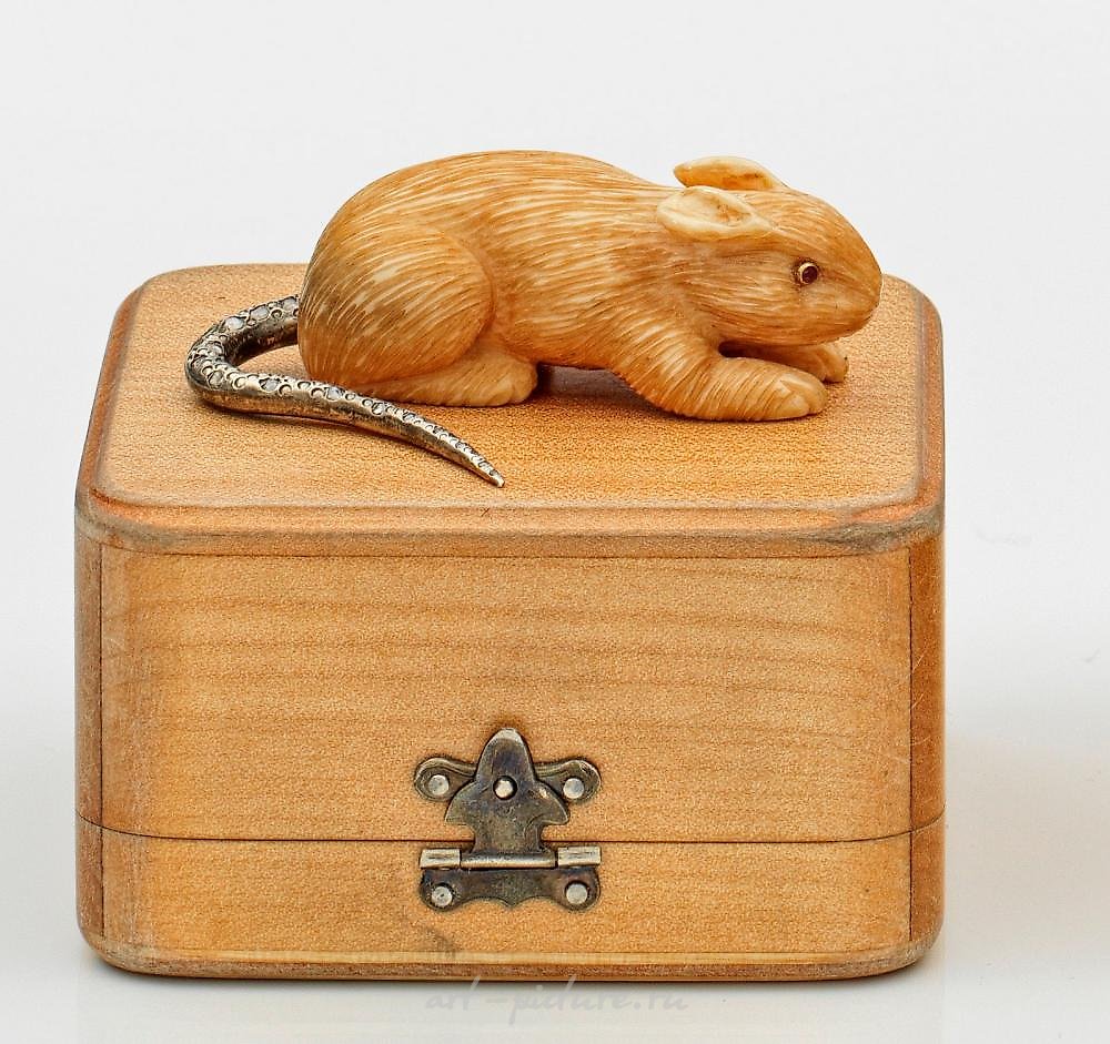 在卡尔·法贝热风格下制作。原装木盒。完全雕刻和精细雕刻成老鼠形状的猛犸象,眼睛上镶有两颗石榴石宝石。银尾巴上装饰着线性排列的小钻石玫瑰花。标记为88。长度为5.4厘米。俄罗斯猛犸象形老鼠雕塑,银尾巴上装饰着小钻石玫瑰花,以卡尔·法贝热风格制作。原装木盒。标准标记。