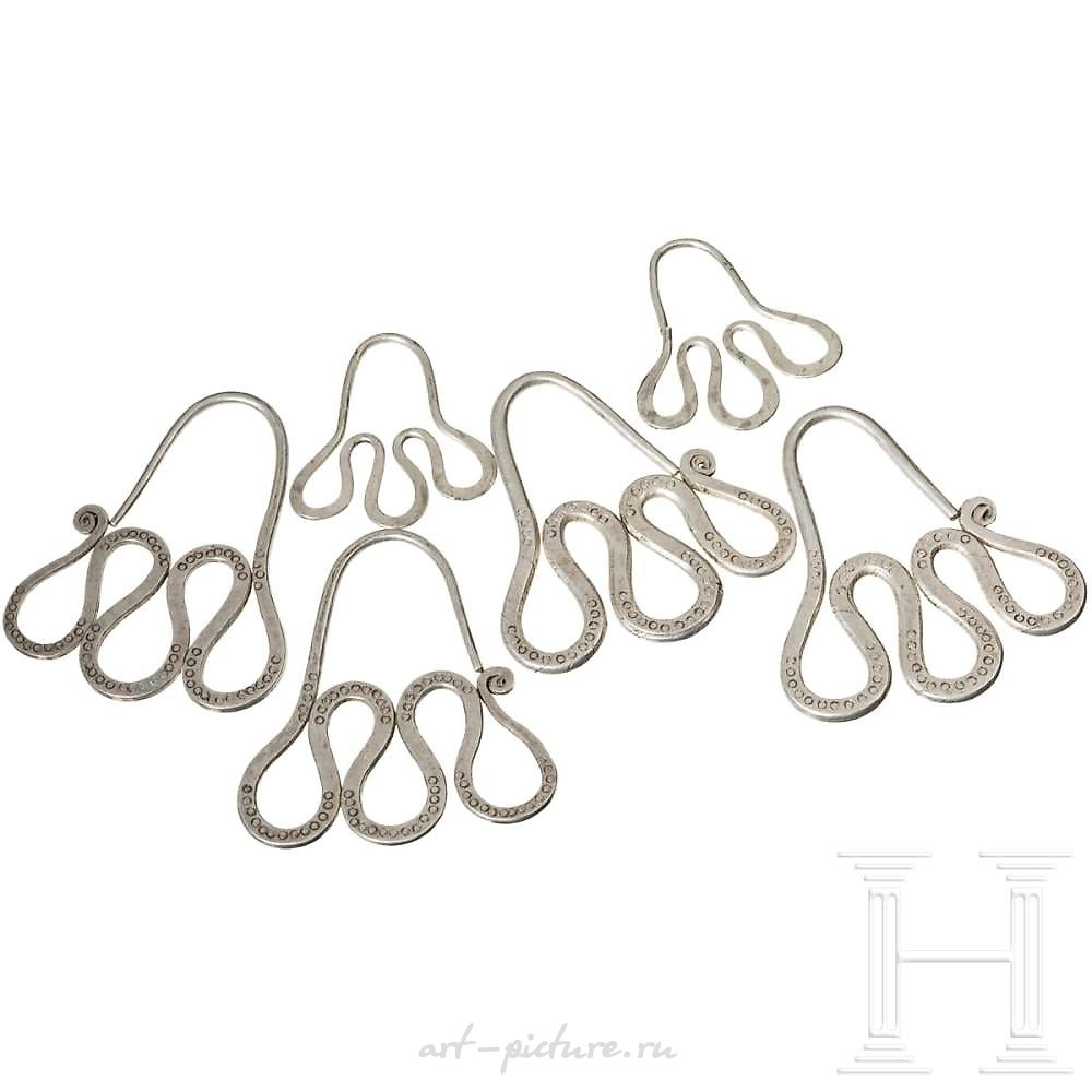 其中有五个大型颈环,两端相互交叠。1)一件饰品,带有棱角的球形末端,装饰有丝线和珠子,在中间有镶嵌玻璃的镶嵌。背面是圆形光滑的,前面是平面的,六边形的,横截面上有圆形的刻痕。直径约为22厘米。2)两个相同的零件,背面是圆形的,前面是螺旋形的。