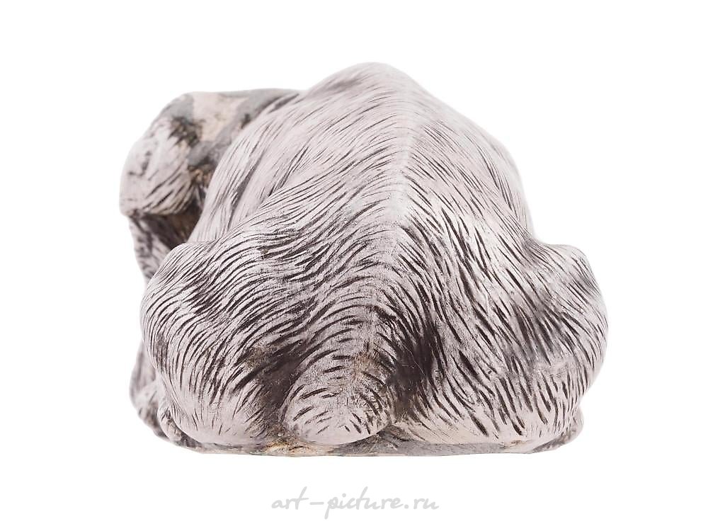 俄罗斯的雕刻银制品,银品位为88。雕刻成英国斗牛犬的形状,雕刻有精细的图案,并用红宝石镶嵌作为眼睛。标有标准的俄罗斯银品位88、制造商标志和其他标记。重量:170克。俄罗斯银制品和收藏品。