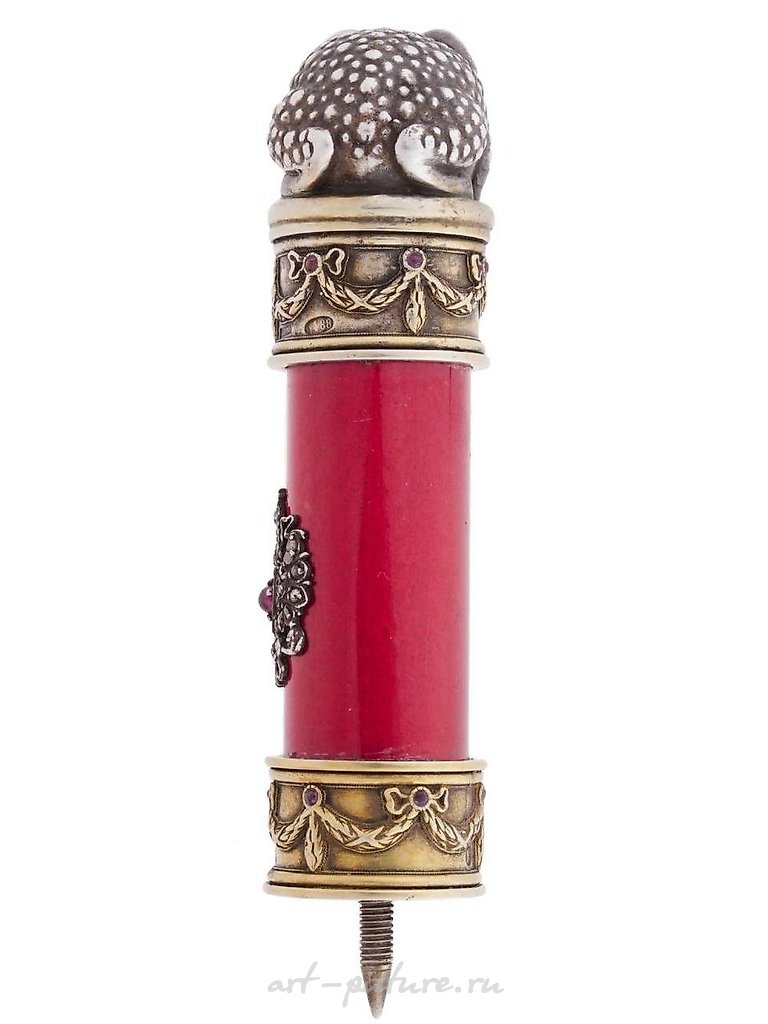 俄罗斯镀金银手杖把手,装饰有俄罗斯帝国徽章,上面有双头鹰的图案,镶嵌有钻石和中央宝石,背景是红色珐琅,周围有两个带带和花环的装饰,采用镂空技术制作。手柄顶部有一只银青蛙,眼睛是宝石。标有制造商标志和银的88纯度标记。原装盒子。总重量:74克。俄罗斯银手杖和时尚配饰。