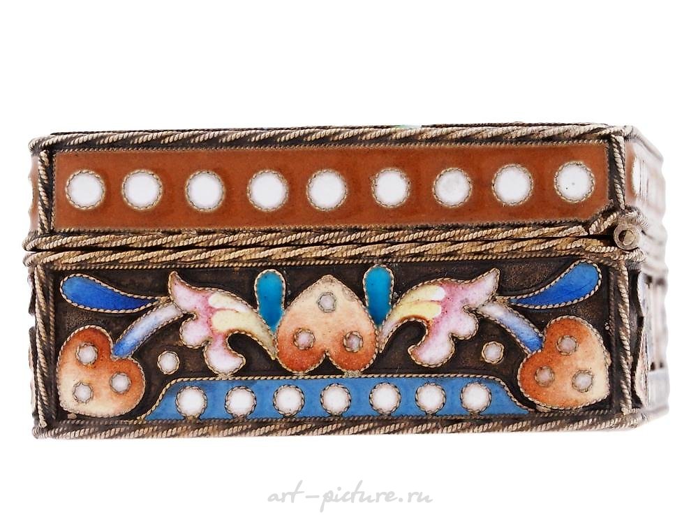 俄罗斯银质珐琅烟盒,镀金装饰,呈矩形形状,带有可翻盖的盖子。采用克鲁松技术装饰,两棵绿色圆锥形树木被精美的叶片图案环绕,图案采用多色调在纹理金色背景上,边缘用珠饰花纹的绳边限定。内部有镀金涂层。标有制造商的标记和84号俄罗斯银质检验标记。附带木盒包装。总重量:149克。俄罗斯银质烟盒。