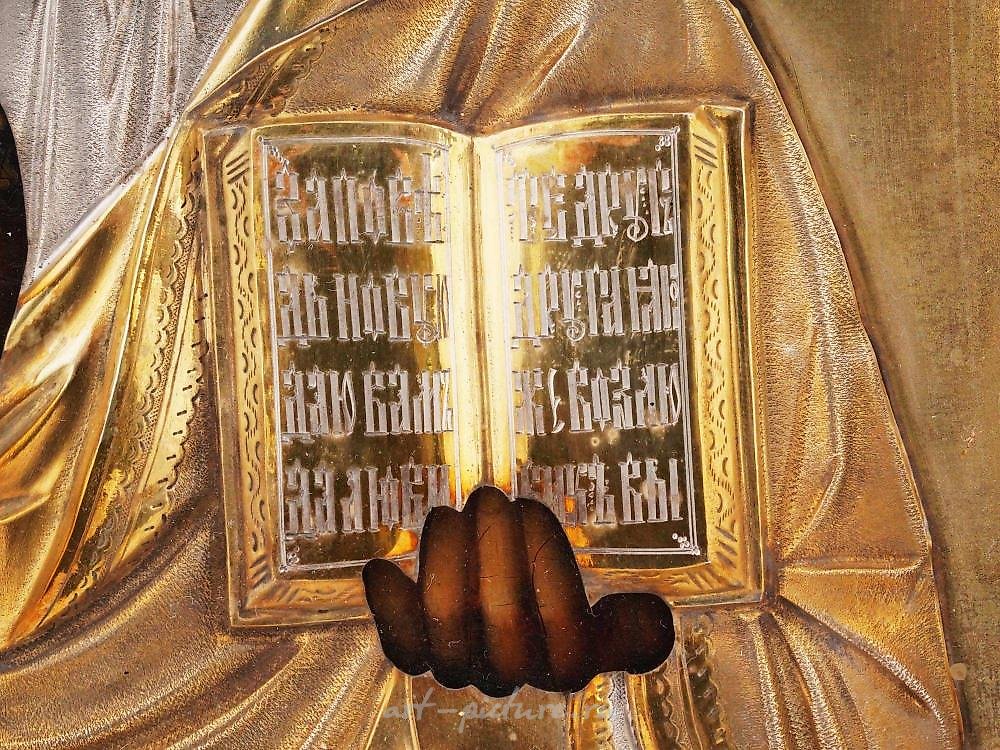 古代俄罗斯东正教手绘基督全能者、全能者或耶稣基督救主的图标。材料:蛋彩、石膏和石灰在木板上。图标装饰有压印的银色外衣或外框,装饰有传统的精细雕刻和雕刻图案。铭文位于底部中央,右上角和左上角。在框架中。大约在19世纪中叶至末期。耶稣基督全能者的图标是其中之一。