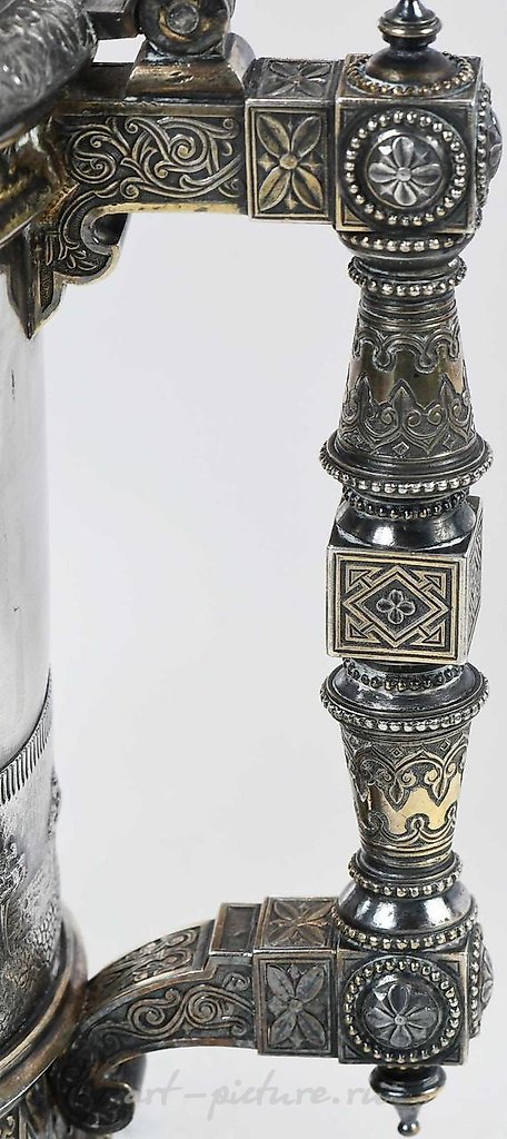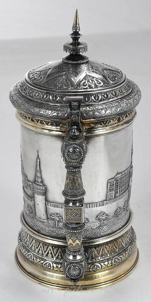 莫斯科,1883年,复杂的阿拉伯式花纹,中间是克里姆林宫的景色,尖塔,镀金内饰,瓦西里·亚历山德罗维奇·彼得罗夫的鉴定标志(1883-1893),重30.61盎司,长10-1/2英寸。来源:诺尔顿收藏,之前属于希尔顿海德。