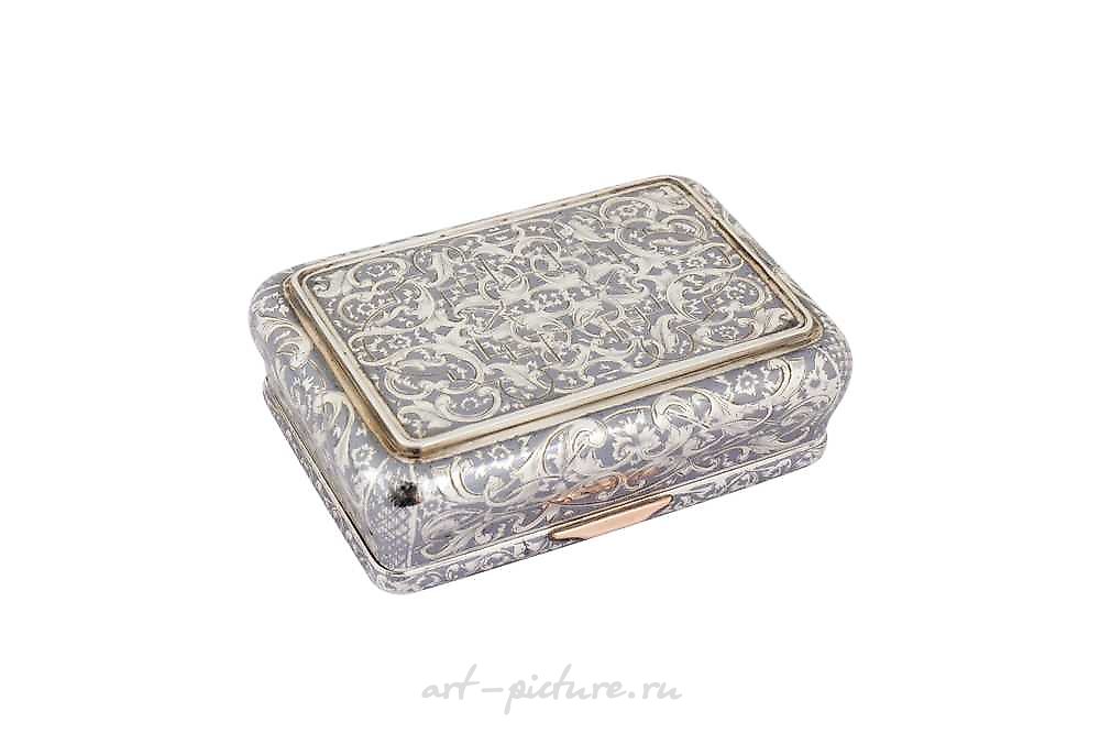 尼古拉一世时期的19世纪中叶俄罗斯烟盒,1853年,莫斯科,作者为F.B.波斯特尼科夫(2946)。矩形形状,带有扶手,带有可翻盖的盖子,盖子由未标记的玫瑰金镶嵌件提起,玫瑰金铰链。盖子上有特维尔斯卡亚广场上的凯旋门图案。侧面有阿拉伯式卷曲图案。内部镀金。标记: