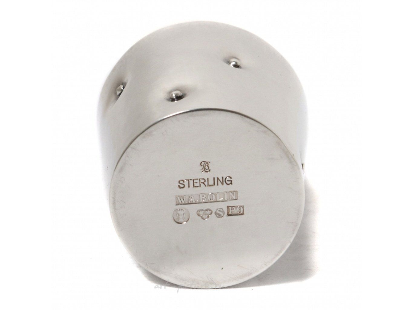 Дизайнерский серебряный стакан W.A. Bolin Дизайнер: Barbro Littmarck (годы жизни: 1918-2008). Швеция, г. Стокгольм, 1965 год, мастерская W.A. Bolin - мастерская наследников великого русского ювелира Вильгельма (Василия) Андреевича Болина из знаменитой династии потомственных придворных поставщиков Российской Империи, иммигрировавших в начале ХХ века в Швецию. Монограмма дизайнера. Высота: 6,5 см, диаметр верха: 6,5 см. Объём: 150 мл. Вес: 102 грамма серебра 925 пробы. Барбро Литтмарк, р. 1918 г. 2008 г. — главный конструктор В.А. Болина с начала работы в 1941 г. до середины 80-х гг. Некоторые из ее самых известных работ включают епископский посох и процессионный крест для Уппсальского собора, а также работы для нескольких других церквей по всей Швеции. Ее работы часто содержали тонкий юмор, забавные и весьма привлекательные нотки. В течение ряда лет она делала небольшие плетеные броши-корзинки из желтого золота с рубиновыми и сапфировыми цветами и эмалевыми листьями. Все 57 различных брошей-корзинок, которые она сделала, были уникальными. Барбро Литтмарк представлена в Стокгольмском национальном музее и в Голдсмит-холле в Лондоне. BARBRO LITTMARCK (1918-2008), an egg-shaped box, W.A Bolin, Stockholm. Barbro Littmarck, b. 1918 d. 2008, was W.A. Bolin's chief designer from the start of her employment in 1941, until the mid 80's. Some of her best known work include the bishop's crosier and processional cross for Uppsala Cathedral, and work for several other churches around Sweden. Her work often contained a subtle humour, an amusing and quite appealing touch. For a number of years, she made small yellow gold woven basket brooches with ruby and sapphire flowers and enamel leaves. The 57 different basket brooches she made were all unique. Barbro Littmarck is represented at the Stockholm National Museum and at the Goldsmith's Hall in London. Designer silver beaker (cup). Designer: Barbro Littmarck (years of life: 1918-2008). Sweden, Stockholm, year 1965, workshop W.A. Bolin. Designer's monogram. Height: 6.5 cm, diameter of the top: 6.5 cm. Volume: 150 ml. Weight: 102 grams of sterling silver 925 fineness.
